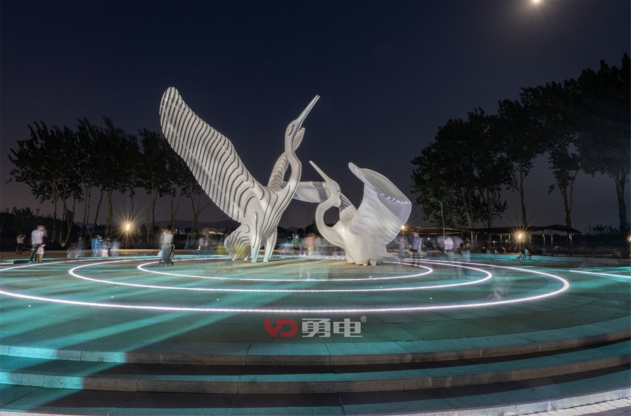 山东省烟台市福山区白鹭广场是内夹河水环境提升项目的重要板块之一,广场以“春波鹭影”为主题打造,采用勇电IP68 LED匀光地埋灯,搭配自主知识产权的防水模块进行安装,并结合音箱设施系统,让灯光动画随着歌曲节奏而变化,达到声光一体的沉浸式灯光氛围。